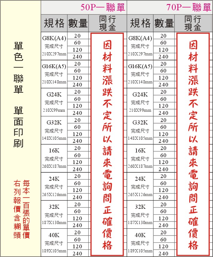 | ※如印製條件不符上列規格,請另外詢價。 |