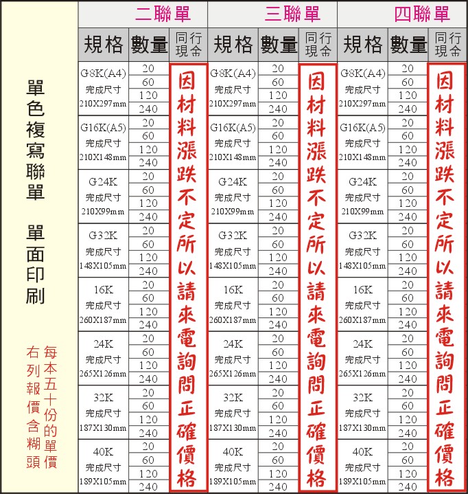 | ※聯數分開300元(聯數說明如果每聯都不一樣需多加版費。) |