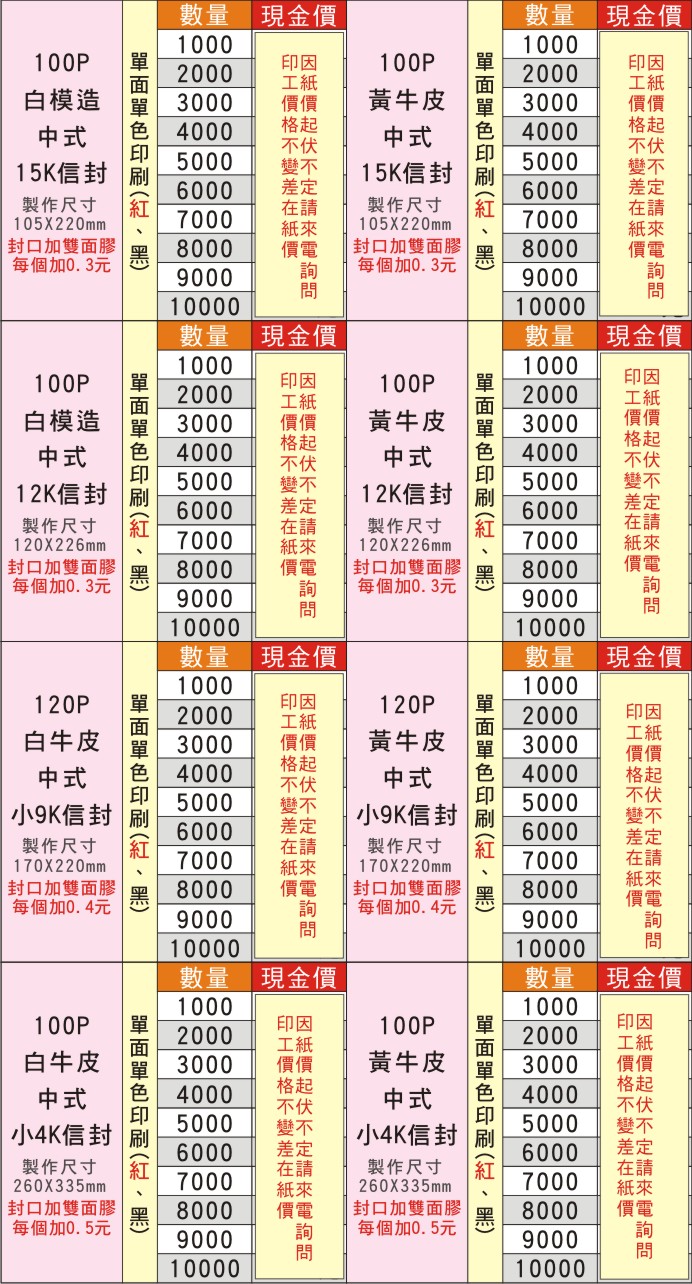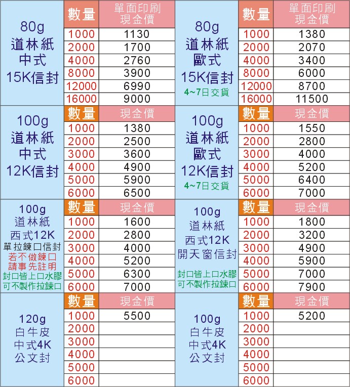 | 一般常用信封單色印刷(不含5%稅) |